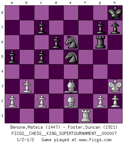 Last move : 1/2-1/2 2020 July 6 17:13:21 [Event "FICGS__CHESS__KING_SUPERTOURNAMENT__000007"] [Site "FICGS"] [Date "2020.04.16"] [Round "1"] [White "Benone,Mateia"] [Black "Foster,Duncan"] [Result "1/2-1/2"] [WhiteElo "1447"] [BlackElo "1921"] 1.e4 e5 2.f4 exf4 3.Nf3 Be7 4.Qe2 d6 5.Nc3 Nc6 6.d4 Bh4+ 7.Nxh4 Qxh4+ 8.Qf2 Qxf2+ 9.Kxf2 Nxd4 10.Bxf4 Ne6 11.Be3 Nf6 12.Be2 O-O 13.Rad1 Bd7 14.Rhe1 Bc6 15.Bf3 a5 16.Nd5 Nd7 17.Ne7+ Kh8 18.Nxc6 bxc6 19.b3 Ne5 20.Be2 f5 21.exf5 Rxf5+ 22.Kg3 Raf8 23.Rf1 R5f6 24.Rxf6 Rxf6 25.Rf1 Rg6+ 26.Kh3 c5 1/2-1/2 KGA : Cunningham defense Kingside Castling by player Black (move 12) This chess game ended in a draw. Follow this game move after move (download)Of all my Russian books, the defense contains and diffuses the greatest 'warmth' which may seem odd seeing how supremely abstract Chess is supposed to be. (Vladimir Nabokov) Schach ist Kampf, hauptsächlich jedoch gegen die eigenen Fehler. (Savielly Grigorievitsch Tartakower) Sin errores no puede haber brillantez. (Emanuel Lasker) Mais n'est-ce pas déjà le limiter injurieusement que d'appeler les échecs un jeu? N'est-ce pas aussi une science, un art, ou quelque chose qui, comme le cercueil de Mahomet entre ciel et terre, est suspendu entre l'un et l'autre, et qui réunit un nombre incroyable de contraires ? (Stefan Zweig) I know the human being and fish can coexist peacefully. (George W. Bush, Saginaw sept. 29, 2000)