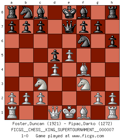 Last move : 1-0 2020 May 29 16:41:30 [Event "FICGS__CHESS__KING_SUPERTOURNAMENT__000007"] [Site "FICGS"] [Date "2020.04.16"] [Round "1"] [White "Foster,Duncan"] [Black "Pipac,Darko"] [Result "1-0"] [WhiteElo "1921"] [BlackElo "1272"] 1.e4 e5 2.f4 exf4 3.Nf3 h6 4.d4 Nf6 5.Bxf4 d5 6.e5 Qe7 7.Nc3 1-0 This chess game has been lost on time (started : 2020.04.16 16:9:28) KGA : Becker defense Player White won this chess game. Follow this game move after move (download)In the perfect Chess combination as in a first-rate short story, the whole plot and counter-plot should lead up to a striking finale, the interest not being allayed until the very last moment. (Yates and Winter) Die FIDE ist dabei in die Hände der russischen Mafia zu fallen. (Larry Evans) Te sientas frente a un tablero y repentinamente tu corazón brinca. Tu mano tiembla al tomar una pieza y moverla. Pero lo que el Ajedrez te enseña es que tu debes permanecer ahí con calma y pensar de que si realmente es una buena idea o de que si hay otras ideas mejores. (Stanley Kubrick) RxDa4 pat (...) Wisdom is the reward you get for a lifetime of listening when you'd have preferred to talk. (Doug Larson)