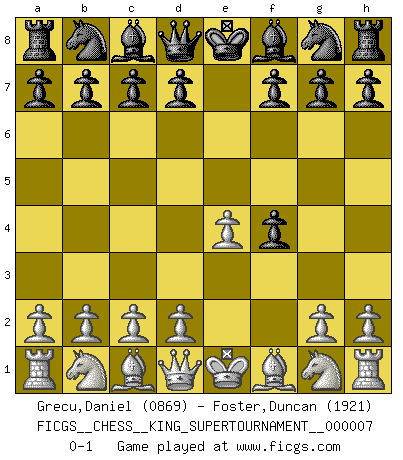 Last move : 0-1 2020 May 17 2:29:2 [Event "FICGS__CHESS__KING_SUPERTOURNAMENT__000007"] [Site "FICGS"] [Date "2020.04.16"] [Round "1"] [White "Grecu,Daniel"] [Black "Foster,Duncan"] [Result "0-1"] [WhiteElo "0869"] [BlackElo "1921"] 1.e4 e5 2.f4 exf4 0-1 This chess game has been lost on time (started : 2020.04.16 16:9:28) King's gambit accepted Player Black won this chess game. Follow this game move after move (download)I don't believe in psychology. I believe in good moves. (Bobby Fischer) Stil? Ich habe keinen Stil! (Anatoly Karpov) El Ajedrez, como cualquier actividad creativa, solo puede existir a través del esfuerzo combinado de aquellos que tienen talento creativo y de aquellos que poseen la habilidad de organizar su trabajo creativo. (Mikhail Botvinnik) Seul un grand joueur sait à quel point il joue faiblement. (Xavier Tartacover) Never risk one's whole fortune unless supported by one's entire army. (Niccolo Machiavelli)