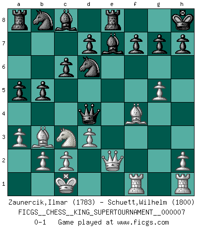 Last move : 0-1 2020 July 28 19:58:14 [Event "FICGS__CHESS__KING_SUPERTOURNAMENT__000007"] [Site "FICGS"] [Date "2020.04.16"] [Round "1"] [White "Zaunercik,Ilmar"] [Black "Schuett,Wilhelm"] [Result "0-1"] [WhiteElo "1783"] [BlackElo "1800"] 1.e4 e5 2.f4 exf4 3.Nf3 Nf6 4.Bc4 Nxe4 5.d3 Nd6 6.Bb3 Qf6 7.Nc3 c6 8.Qe2+ Be7 9.Bd2 O-O 10.O-O-O a5 11.a3 b5 12.g4 Re8 13.g5 Qf5 14.Nd4 Qc5 15.Bxf4 Qxd4 16.Rdf1 Kh8 0-1 This chess game has been lost on time (started : 2020.04.16 16:9:28) KGA : Schallop defense Kingside Castling by player Black (move 9) Queenside Castling by player White (move 10) Player Black won this chess game. Follow this game move after move (download)When you play Bobby, it is not a question if you win or lose. It is a question if you survive. (Boris Spassky) Weshalb minderdergeübte Spieler mit g2-g4 beginnen? Die betreffenden sind unschlüssig, ob sie nun rechts (h4) oder links (f4) beginnen sollen, und in ihrer Ratlosigkeit entschliessen sie sich nach guter Bürgerart dazu, den goldenen Mittelweg zu wählen. (Aaron Nimzowitsch) Yo he agregado estos principios a la ley: pongan los Caballos en acción antes de que los dos Alfiles sean desarrollados. (Emanuel Lasker) Le système Elo représente seulement une moyenne. Il est simplement un indicateur de votre stabilité. (Anatoli Karpov) The ultimate in disposing one's troops is to be without ascertainable shape. Then the most penetrating spies cannot pry in nor can the wise lay plans against you. (Sun Tzu)