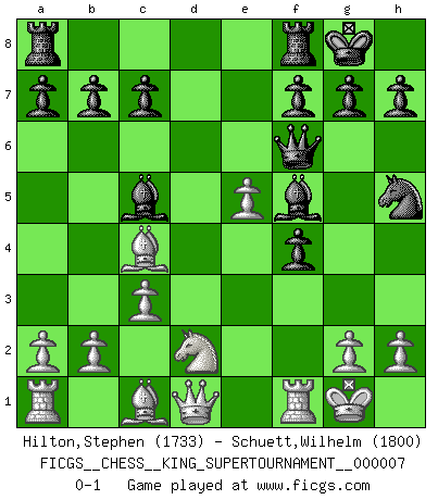 Last move : 0-1 2020 May 19 13:52:5 [Event "FICGS__CHESS__KING_SUPERTOURNAMENT__000007"] [Site "FICGS"] [Date "2020.04.16"] [Round "1"] [White "Hilton,Stephen"] [Black "Schuett,Wilhelm"] [Result "0-1"] [WhiteElo "1733"] [BlackElo "1800"] 1.e4 e5 2.f4 exf4 3.Nf3 Nf6 4.e5 Nh5 5.Bc4 d5 6.exd6 Bxd6 7.d4 O-O 8.O-O Nc6 9.c3 Bf5 10.Nbd2 Qf6 11.Ne5 Nxe5 12.dxe5 Bc5+ 0-1 KGA : Schallop defense Kingside Castling by player Black (move 7) Kingside Castling by player White (move 8) Player Black won this chess game. Follow this game move after move (download)If one piece is badly posted, the whole game is bad. (Tarrasch) Früher wurde jeder komplizierte Zug, jedes interessante Opfer mit großem Beifall und Enthusiasmus aufgenommen. Heute schaltet man einfach seinen Fritz an, und man kann sehen, was los ist, ob der Zug geht oder nicht. (Vladimir Kramnik) El Ajedrez es despiadado: debes de estar preparado para matar gente. (Nigel Short) Vouloir jouer aux échecs contre soi-même est aussi paradoxal que vouloir marcher sur son ombre. (Stefan Zweig) A government big enough to give you everything you want is strong enough to take everything you have. (Thomas Jefferson)