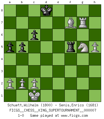 Last move : 1-0 2020 July 12 19:7:14 [Event "FICGS__CHESS__KING_SUPERTOURNAMENT__000007"] [Site "FICGS"] [Date "2020.04.16"] [Round "1"] [White "Schuett,Wilhelm"] [Black "Senis,Enrico"] [Result "1-0"] [WhiteElo "1800"] [BlackElo "1681"] 1.e4 e5 2.f4 exf4 3.Nf3 d6 4.d4 Nf6 5.Nc3 Bg4 6.Bxf4 Be7 7.h3 Bh5 8.g4 Bg6 9.Qe2 O-O 10.O-O-O Re8 11.Bg2 c6 12.Nd2 Nbd7 13.h4 h6 14.h5 Bh7 15.Rdg1 Qb6 16.Be3 a5 17.Rh3 Qc7 18.g5 hxg5 19.Bxg5 b5 20.Rg3 d5 21.e5 Ne4 22.Ncxe4 dxe4 23.Bxe4 Kf8 24.Bxh7 Bxg5 25.Rxg5 Ke7 26.Rxg7 Rf8 27.Rf1 Rae8 28.Bg6 Kd8 29.R1xf7 Rxf7 30.Bxf7 Nxe5 31.dxe5 Qxe5 32.Qxe5 Rxe5 33.Nf3 Rf5 34.Ng5 1-0 KGA : Fischer defense Kingside Castling by player Black (move 9) Queenside Castling by player White (move 10) Player White won this chess game. Follow this game move after move (download)Fischer is completely natural. He plays no roles. He's like a child. Very, very simple. (Zita Rajcsanyi) Die Leute spielen gegen mich seit 15 Jahren unter Ihren Möglichkeiten. (Robert James Fischer) Si el ingenio solamente fuese necesario para lucirse, las mujeres serían las mejores jugadoras de Ajedrez del mundo. (Albin) Les échecs, c'est l'art d'analyser. (Mikhail Botvinnik) The existence of forgetting has never been proved: We only know that some things don't come to mind when we want them. (Friedrich Nietzsche)