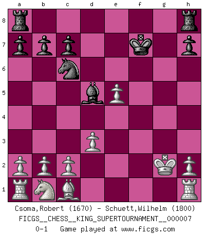 Last move : 0-1 2020 July 8 20:16:20 [Event "FICGS__CHESS__KING_SUPERTOURNAMENT__000007"] [Site "FICGS"] [Date "2020.04.16"] [Round "1"] [White "Csoma,Robert"] [Black "Schuett,Wilhelm"] [Result "0-1"] [WhiteElo "1670"] [BlackElo "1800"] 1.e4 e5 2.f4 exf4 3.Nf3 Nf6 4.d3 d5 5.e5 Nh5 6.Be2 g5 7.Nxg5 Qxg5 8.Bxh5 Qh4+ 9.Kf1 Bc5 10.Qf3 Nc6 11.Bxf7+ Kxf7 12.Qxd5+ Be6 13.Qxc5 f3 14.Qf2 Qxf2+ 15.Kxf2 fxg2 16.Kxg2 Bd5+ 0-1 KGA : Schallop defense Player Black won this chess game. Follow this game move after move (download)Good positions don't win games, good moves do. (Gerald Abrahams) Modernes Schach erfordert enorme Anspannung. Es ist für einen normalen Menschen unmöglich das auszuhalten. (Viktor Kortschnoi) Tu sabes, camarada Pachman, no disfruto el ser un Ministro, preferería jugar al Ajedrez como tu. (Che Guevara) À la honte des hommes, on sait que les lois du jeu sont les seules qui soient partout justes, claires, inviolables et exécutées. Pourquoi l'Indien qui a donné les règles du jeu d'échecs est-il obéi de bon gré dans toute la terre, et que les décrétales des papes, par exemple, sont aujourd'hui un objet d'horreur et de mépris ? C'est que l'inventeur des échecs combina tout avec justesse pour la satisfaction des joueurs, et que les papes, dans leurs décrétales, n'eurent en vue que leur seul avantage. L'Indien voulut exercer également l'esprit des hommes et leur donner du plaisir; les papes ont voulu abrutir l'esprit des hommes. Voltaire (Dictionnaire philosophique / Garnier 1967) If only people were all showed a certain minimum level of niceness; if only people didn't retract verbal draw offers (without draw box ticked) on ficgs; if only people didn't kill; if only people didn't run concentration / extermination camps, if only people didn't drop nuclear bombs on Hiroshima and Nagasaki, and so on - it would be a much more beautiful world. But sadly, things are not so... (Normajean Yates)