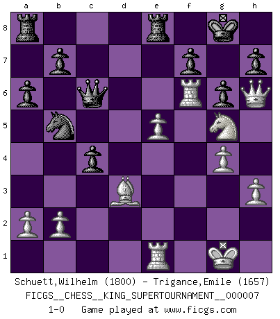 Last move : 1-0 2020 August 2 15:32:1 [Event "FICGS__CHESS__KING_SUPERTOURNAMENT__000007"] [Site "FICGS"] [Date "2020.04.16"] [Round "1"] [White "Schuett,Wilhelm"] [Black "Trigance,Emile"] [Result "1-0"] [WhiteElo "1800"] [BlackElo "1657"] 1.e4 e5 2.f4 Bc5 3.Nf3 d6 4.c3 Nf6 5.d4 exd4 6.cxd4 Bb4+ 7.Bd2 Bxd2+ 8.Nbxd2 O-O 9.Bd3 Bg4 10.Qb3 Qc8 11.O-O Nc6 12.Qc3 a6 13.h3 Bh5 14.f5 Bxf3 15.Nxf3 Re8 16.Rae1 Na7 17.g4 Nb5 18.Qc2 c5 19.e5 dxe5 20.dxe5 Nd5 21.f6 g6 22.Qc1 Qc6 23.Qh6 Nxf6 24.Ng5 c4 25.Rxf6 1-0 KGD : Classical, 4.c3 Kingside Castling by player Black (move 8) Kingside Castling by player White (move 11) Player White won this chess game. Follow this game move after move (download)Modern Chess is too much concerned with things like Pawn structure. Forget it, Checkmate ends the game. (Nigel Short) Fischer machte Schach einfach zu einer aufregenden Sache, wann immer er sich ans Brett setzte. (Raymond Keene) La señal de un Gran Maestro es su habilidad de ganar una partida rápidamente y sin dolor. (Irving Chernev) Les Echecs, c'est l'art de la guerre sans les charniers, c'est la résurrection des morts tombés au champ d'honneur, l'espoir perpétuel, la suprématie de l'intelligence sur la force, la culture de l'esprit. (F. Szpiner) At work, the authority of a person is inversely proportional to the number of pens that person is carrying. (Dan Rotaru)