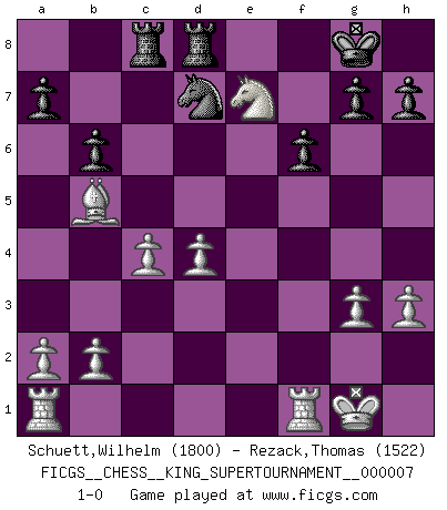 Last move : 1-0 2020 May 4 12:22:19 [Event "FICGS__CHESS__KING_SUPERTOURNAMENT__000007"] [Site "FICGS"] [Date "2020.04.16"] [Round "1"] [White "Schuett,Wilhelm"] [Black "Rezack,Thomas"] [Result "1-0"] [WhiteElo "1800"] [BlackElo "1522"] 1.e4 e5 2.f4 d5 3.exd5 Qh4+ 4.g3 Qf6 5.Qe2 Bd6 6.fxe5 Qxe5 7.d4 Qxe2+ 8.Nxe2 Nf6 9.Bg2 O-O 10.O-O Nbd7 11.c4 b6 12.Nbc3 Re8 13.h3 Bb7 14.Bf4 Bxf4 15.Nxf4 c5 16.dxc6 Bxc6 17.Bxc6 Rac8 18.Bb5 Red8 19.Nfd5 Nxd5 20.Nxd5 f6 21.Ne7+ 1-0 KGD : Falkbeer counter-gambit Kingside Castling by player Black (move 9) Kingside Castling by player White (move 10) Player White won this chess game. Follow this game move after move (download)Chess is a matter of delicate judgment, knowing when to punch and how to duck. (Bobby Fischer) Nie in meinem Leben habe ich die französische Verteidigung gespielt, welche die Stumpfsinnigste von allen ist. (Wilhelm Steinitz) Realmente no sabemos como el juego fue inventado, aunque hay sospechas. Tan pronto como descubramos a los culpables, se los haremos saber. (Bruce Pandolfini) Avec des compensations pour le matériel en plus... (Anonyme) First of all, we have to go back to the classical time control. (Anatoly Karpov)