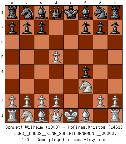 Last move : 1-0 2020 May 19 4:49:41 [Event "FICGS__CHESS__KING_SUPERTOURNAMENT__000007"] [Site "FICGS"] [Date "2020.04.16"] [Round "1"] [White "Schuett,Wilhelm"] [Black "Kofinas,Xristos"] [Result "1-0"] [WhiteElo "1800"] [BlackElo "1461"] 1.e4 e5 2.f4 exf4 3.Nf3 d5 4.exd5 1-0 This chess game has been lost on time (started : 2020.04.16 16:9:28) KGA : Abbazia defense (Classical defense, Modern defense!) Player White won this chess game. Follow this game move after move (download)The older I grow, the more I value Pawns. (Keres) Es hat in meinem Leben Zeiten gegeben, da ich sehr nahe daran war zu glauben, daß ich auch nicht eine einzige Schachpartie verlieren könnte. (José Raúl Capablanca) En manos de Fischer's, una diminuta ventaja teórica es tan buena como tener una Reina de ventaja. (Isaac Kashdan) Le jeu d'échecs est comme rejeté hors du temps. (Antoine de Saint-Exupéry) Now the reason the enlightened prince and the wise general conquer the enemy whenever they move and their achievements surpass those of ordinary men is foreknowledge. (Sun Tzu)