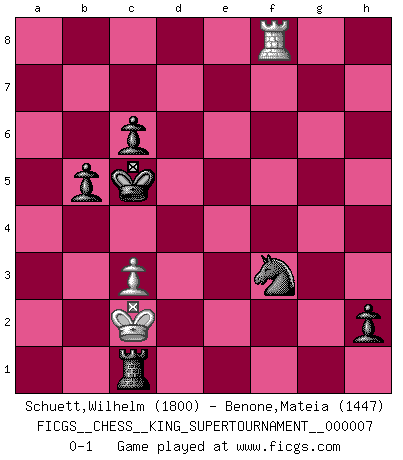 Last move : 0-1 2020 September 8 9:43:38 [Event "FICGS__CHESS__KING_SUPERTOURNAMENT__000007"] [Site "FICGS"] [Date "2020.04.16"] [Round "1"] [White "Schuett,Wilhelm"] [Black "Benone,Mateia"] [Result "0-1"] [WhiteElo "1800"] [BlackElo "1447"] 1.e4 e5 2.f4 exf4 3.Nf3 g5 4.d4 g4 5.Bxf4 gxf3 6.Qxf3 d6 7.Bc4 Qh4+ 8.Bg3 Qf6 9.Qb3 Nc6 10.c3 Bh6 11.Na3 a6 12.Rf1 Qg5 13.Bxf7+ Kd8 14.Qc2 Nf6 15.Bf4 Qg7 16.e5 Bxf4 17.Rxf4 dxe5 18.dxe5 Nxe5 19.O-O-O Bd7 20.Be6 Kc8 21.Qf5 Re8 22.Bxd7+ Nexd7 23.Rfd4 Qh6+ 24.Kb1 Qg6 25.Qxg6 hxg6 26.h4 b5 27.Nc2 Re2 28.g4 Ne5 29.g5 Nfg4 30.a4 Kb7 31.axb5 axb5 32.Rg1 Ne3 33.Nxe3 Rxe3 34.Rb4 c6 35.h5 gxh5 36.g6 Rg8 37.g7 Nc4 38.b3 Nd2+ 39.Kc2 Nf3 40.Rg6 Re2+ 41.Kb1 Rd8 42.Rd4 Nxd4 43.g8Q Rxg8 44.Rxg8 Nxb3 45.Rh8 Rh2 46.Rh7+ Kb6 47.Rh6 h4 48.Rh5 h3 49.Rh4 Nd2+ 50.Kc1 Nf3 51.Rh8 Rh1+ 52.Kc2 h2 53.Rb8+ Kc5 54.Rf8 Rc1+ 0-1 KGA : Rosentreter gambit Queenside Castling by player White (move 19) Promotion Queen by player White (move 43) 10 pieces endgame at move 44 : White KRPP , Black KRNPPP WHITE : King + 1 Rook 2 Pawns BLACK : King + 1 Rook 1 Knight 3 Pawns 9 pieces endgame at move 44 : White KRP , Black KRNPPP WHITE : King + 1 Rook 1 Pawn BLACK : King + 1 Rook 1 Knight 3 Pawns Player Black won this chess game. Follow this game move after move (download)There must have been a time when men were demigods, or they could not have invented Chess. (Gustav Schenk) Habe Mut, dich deines eigenen Verstandes zu bedienen. (Immanuel Kant) ¿Que sería del Ajedrez sin errores graciosos?. (Kurt Richter) Vous m'avez demandé de vous exposer quel est le fondement de la prière. Je ne fais que préparer les pièces du jeu sur la table... Nous sera-t-il permis d'en adopter les règles et si nous les appliquons scrupuleusement nous ne tarderons pas à faire mat le Roi divin ! Il ne pourra échapper à nos mains. (Sainte Thérèse d'Avila, Chemin de perfection) The obstacle is the path. (Zen proverb)