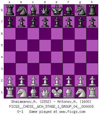 Last move : 0-1 2007 August 10 21:3:22 [Event "FICGS__CHESS__WCH_STAGE_1_GROUP_04__000003"] [Site "FICGS"] [Date "2007.07.11"] [Round "1"] [White "Shalamanov,Alexander"] [Black "Antonov,Andrei"] [Result "0-1"] [WhiteElo "2252"] [BlackElo "1600"] 0-1 This chess game has been lost on time (started : 2007.07.11 16:53:34) Player Black won this chess game. Follow this game move after move (download)Chess is played with the mind and not with the hands ! (Renaud and Kahn) Wir können eben der zündenden Macht des Opfers nicht wiederstehen, denn die Begeisterung für das Opfer liegt in der Natur des Menschen. (Rudolf Spielmann) Yo considero que Fischer es uno de los expertos mas grandes de aperturas de siempre. (Keith Hayward) Demandez au pauvre Cg1 ce qu'il en pense. Eduard Gufeld à propos de la variante Saemisch de l'Est-Indienne. I don't believe in psychology. I believe in good moves. (Bobby Fischer)