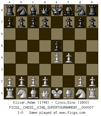 Last move : 1-0 2020 May 17 2:29:2 [Event "FICGS__CHESS__KING_SUPERTOURNAMENT__000007"] [Site "FICGS"] [Date "2020.04.16"] [Round "1"] [White "Klivar,Adam"] [Black "Cinco,Dino"] [Result "1-0"] [WhiteElo "1748"] [BlackElo "1800"] 1.e4 e5 2.f4 1-0 This chess game has been lost on time (started : 2020.04.16 16:9:28) King's gambit Player White won this chess game. Follow this game move after move (download)I love all positions. Give me a difficult positional game, I will play it. But totally won positions, I cannot stand them. (Hein Donner) Ich kenne keine einzige Person, die behaupten würde, Garri Kasparow sei ein guter Mensch (Nigel Short) Después de la respuesta de las negras a 1.e4 con 1..e5, se quedan siempre tratando de entrar dentro del juego. (Howard Staunton) Il vaut toujours mieux jouer un plan faux de façon logique que de n'avoir pas de plan du tout. (Victor Kortchnoï) When you stop learning you start dying. (M. Scott Adams)
