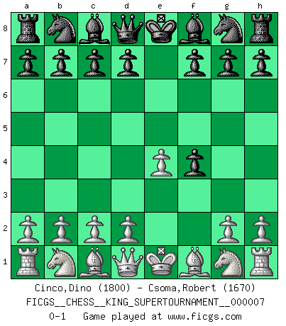Last move : 0-1 2020 May 18 15:26:13 [Event "FICGS__CHESS__KING_SUPERTOURNAMENT__000007"] [Site "FICGS"] [Date "2020.04.16"] [Round "1"] [White "Cinco,Dino"] [Black "Csoma,Robert"] [Result "0-1"] [WhiteElo "1800"] [BlackElo "1670"] 1.e4 e5 2.f4 exf4 0-1 This chess game has been lost on time (started : 2020.04.16 16:9:28) King's gambit accepted Player Black won this chess game. Follow this game move after move (download)By the beauty of his games, the clarity of his play, and the brilliance of his ideas, Fischer made himself an artist of the same stature as Brahms, Rembrandt, and Shakespeare. (David Levy) Wer mein Gambit spielt, muß bereit sein, alle Brücken hinter sich abzubrechen. Es verändert den ganzen Menschen. Es wirkt wie ein Zauberstab und fördert verkümmerte, gute Charakter- eigenschaften wieder zu Tage. (Emil Joseph Diemer) La batalla por la última verdad nunca sera ganada. Y es por eso que el Ajedrez es tan fascinante. (Hans Kmoch) En blitz, le Cavalier l'emporte sur le Fou. (Vlastimil Hort) 'preceded by its own quotation yields a falsehood' preceded by its own quotation yields a falsehood. (W. V. O. Quine - Set Theory And Its Logic, 1953)