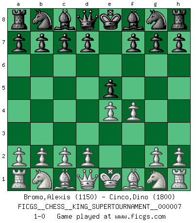Last move : 1-0 2020 May 17 2:29:2 [Event "FICGS__CHESS__KING_SUPERTOURNAMENT__000007"] [Site "FICGS"] [Date "2020.04.16"] [Round "1"] [White "Bromo,Alexis"] [Black "Cinco,Dino"] [Result "1-0"] [WhiteElo "1150"] [BlackElo "1800"] 1.e4 e5 2.f4 1-0 This chess game has been lost on time (started : 2020.04.16 16:9:28) King's gambit Player White won this chess game. Follow this game move after move (download)We cannot resist the fascination of sacrifice, since a passion for sacrifices is part of a Chessplayer's nature. (Rudolf Spielman) Das Schach hält seine Meister in eigenen Banden, Fesseln; auf vielerlei Weise formt es ihren Geist, so dass die innere Freiheit selbst des Stärksten beeinflusst wird. (Albert Einstein) Muchos se han convertido en Maestros de Ajedrez, nadie se ha convertido en el Maestro del Ajedrez. (Siegbert Tarrasch) Assurément je connaissais par expérience le mystérieux attrait de ce jeu royal, le seul entre tous les jeux inventés par les hommes qui échappe souverainement à la tyrannie du hasard, le seul où l'on ne doive sa victoire qu'à son intelligence ou plutôt à une certaine forme d'intelligence. Mais n'est-ce pas déjà le limiter injurieusement que d'appeler les échecs un jeu ? N'est-ce pas une science, un art ou quelque chose qui, comme le cercueil de Mahomet entre ciel et terre, est suspendu entre l'un et l'autre, et qui réunit un nombre incroyable de contraires ? [...] C'est une pensée qui ne mène à rien, une mathématique qui n'établit rien, un art qui ne laisse pas d'uvre, une architecture sans matière; et il l'a prouvé néanmoins qu'il était plus durable, à sa manière, que les livres ou que tout autre monument, ce jeu unique qui appartient à tous les peuples et à tous les temps, et dont personne ne sait quel dieu en fit don à la terre pour tuer l'ennui, pour aiguiser l'esprit et stimuler l'âme. Où commence-t-il, où finit-il ? (Stefan Zweig) Creativity is allowing yourself to make mistakes. Art is knowing which ones to keep. (Scott Adams)