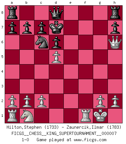 Last move : 1-0 2020 June 12 1:48:11 [Event "FICGS__CHESS__KING_SUPERTOURNAMENT__000007"] [Site "FICGS"] [Date "2020.04.16"] [Round "1"] [White "Hilton,Stephen"] [Black "Zaunercik,Ilmar"] [Result "1-0"] [WhiteElo "1733"] [BlackElo "1783"] 1.e4 e5 2.f4 exf4 3.Nf3 d6 4.d4 g5 5.Bc4 g4 6.O-O gxf3 7.Qxf3 Bh6 8.Bxf4 Be6 9.Bxe6 fxe6 10.Bxh6 Nxh6 11.Qh5+ Kd7 12.Qxh6 Nc6 13.d5 exd5 14.exd5 1-0 This chess game has been lost on time (started : 2020.04.16 16:9:28) KGA : Fischer defense Kingside Castling by player White (move 6) Player White won this chess game. Follow this game move after move (download)I play correspondence chess because it is both art and science while chess is art only. (A player at FICGS) Es hat in meinem Leben Zeiten gegeben, da ich sehr nahe daran war zu glauben, daß ich auch nicht eine einzige Schachpartie verlieren könnte. (José Raúl Capablanca) Aún deseo matar a Fischer. (Boris Spassky) Dans le domaine de la peinture, de la gravure et de la sculpture, dès la première décennie de notre siècle, les artistes abandonnent la représentation de la partie d'échecs pour se concentrer sur les pièces, sur les échiquiers et sur toutes les variations auxquelles les unes et les autres peuvent donner lieu. On passe en quelque sorte d'un thème social à un thème musical (au sens de la musica médiévale, c'est-à-dire d'une notion qui inclue le rythme, l'harmonie, la construction et la déconstruction, etc.). Graphiquement et picturalement, l'échiquier apparaît comme une structure ouverte, dynamique, d'une richesse infinie, autorisant toutes les combinatoires et débouchant sur des mouvements et des rythmes de nature exponentielle. (Michel Pastoureau) An expert is a man who has made all the mistakes which can be made in a very narrow field. (Niels Bohr)
