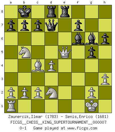 Last move : 0-1 2020 June 8 23:49:55 [Event "FICGS__CHESS__KING_SUPERTOURNAMENT__000007"] [Site "FICGS"] [Date "2020.04.16"] [Round "1"] [White "Zaunercik,Ilmar"] [Black "Senis,Enrico"] [Result "0-1"] [WhiteElo "1783"] [BlackElo "1681"] 1.e4 e5 2.f4 exf4 3.Nf3 d6 4.Bc4 h6 5.Nc3 Bg4 6.O-O Nf6 7.d4 Be7 8.Bxf4 g5 9.Bg3 Nc6 10.Qd3 Qd7 11.h3 Bh5 12.e5 Bg6 13.Qe2 dxe5 14.Bxe5 O-O-O 15.Nd2 Kb8 16.Nb5 Nxe5 17.Qxe5 Rhe8 18.Rxf6 Bxf6 0-1 This chess game has been lost on time (started : 2020.04.16 16:9:28) KGA : Fischer defense Kingside Castling by player White (move 6) Queenside Castling by player Black (move 14) Player Black won this chess game. Follow this game move after move (download)Fischer is the strongest player in the world. In fact, the strongest player who ever lived. (Larry Evans) Im Schach nämlich geht es darum, daß Ich des Gegners klein zu kriegen, sein Ego zu zerbrechen und zu zermahlen, seine Selbstachtung zu zertreten und zu verscharren und seine ganze mißachtenswerte sogenannte Persönlichkeit ein für alle Mal tot zu hacken und zu zerstampfen und dadurch die menschliche Gesellschaft von einer stinkenden Pestbeule zu befreien. Es ist ein königliches Spiel. (Robert James Fischer) El Ajedrez es tan interesante por sí solo, que no es necesario un interés monetario para persuadir a una persona a que lo practique; por lo tanto, nunca se juega por dinero. (Benjamin Franklin) Les échecs sont plus proches de l'art de l'assassinat que de l'art de la guerre. (Arturo Perez-Reverte) Dave, my mind is going. I can feel it. (HAL 9000 in 2001, a space odyssey)