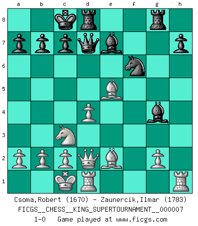 Last move : 1-0 2020 June 8 10:58:43 [Event "FICGS__CHESS__KING_SUPERTOURNAMENT__000007"] [Site "FICGS"] [Date "2020.04.16"] [Round "1"] [White "Csoma,Robert"] [Black "Zaunercik,Ilmar"] [Result "1-0"] [WhiteElo "1670"] [BlackElo "1783"] 1.e4 e5 2.f4 exf4 3.Nf3 d6 4.d4 g5 5.h4 Nc6 6.hxg5 Bg4 7.Bxf4 Qd7 8.Nc3 O-O-O 9.Be2 Be7 10.Qd2 f6 11.gxf6 Nxf6 12.O-O-O Rhg8 13.e5 dxe5 14.Nxe5 Nxe5 15.Bxe5 1-0 This chess game has been lost on time (started : 2020.04.16 16:9:28) KGA : Fischer defense Queenside Castling by player Black (move 8) Queenside Castling by player White (move 12) Player White won this chess game. Follow this game move after move (download)I have never in my life played the French Defence, which is the dullest of all openings. (Wilhelm Steinitz) Das typische an einem Großmeister ist, daß er eine gewonnene Position schnell und schmerzlos gewinnt. (Irving Chernev) Antes de los Finales, los dioses han colocado el Juego Medio. (Siegbert Tarrasch) A chaque perte on perd un peu de soi. (Joël Lautier) Methinks King Thibault should dub Marius Zubac a knight of the square board... I mean table, henceforth addressing him as Sir Marius, and bestow on him a suitable land from the kingdom of FICGS & marry him off to a worthy, fair maiden, lest he slice our heads with his mighty sword in his wrath. (Dinesh De Silva)