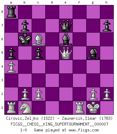 Last move : 1-0 2020 June 15 7:29:12 [Event "FICGS__CHESS__KING_SUPERTOURNAMENT__000007"] [Site "FICGS"] [Date "2020.04.16"] [Round "1"] [White "Cirovic,Zeljko"] [Black "Zaunercik,Ilmar"] [Result "1-0"] [WhiteElo "1522"] [BlackElo "1783"] 1.e4 e5 2.f4 exf4 3.Nf3 d6 4.d4 g5 5.Bc4 g4 6.Bxf4 gxf3 7.Qxf3 Qe7 8.Bg5 Qd7 9.O-O Nh6 10.Bxh6 Bxh6 11.Bxf7+ Kd8 12.Qf6+ Qe7 13.Qxh8+ Kd7 14.e5 dxe5 15.dxe5 Bg5 16.e6+ Kc6 17.Be8+ Kb6 18.a4 a5 19.Qd4+ c5 20.Qd5 Bxe6 21.Qe5 Nc6 22.Bxc6 1-0 This chess game has been lost on time (started : 2020.04.16 16:9:28) KGA : Fischer defense Kingside Castling by player White (move 9) Player White won this chess game. Follow this game move after move (download)Pawn endings are to Chess what putting is to golf. (Cecil Purdy) Ich weiss nicht was Gott gegen mich auf 1.e4 antworten würde. (Robert James Fischer) El Ajedrez es realmente noventa y nueve por ciento calculación. (Soltis) Si le désir cupide (et stupide) de gagner est une inépuisable source de souffrance, une combinaison brillante sur l'échiquier est une découverte : le coquelicot qui s'épanouit lorsque apparaît la Voie Lactée. (Arrabal) It's unlucky to be superstitious. (Dave Enteles)