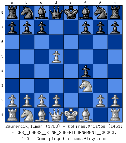 Last move : 1-0 2020 May 19 17:5:30 [Event "FICGS__CHESS__KING_SUPERTOURNAMENT__000007"] [Site "FICGS"] [Date "2020.04.16"] [Round "1"] [White "Zaunercik,Ilmar"] [Black "Kofinas,Xristos"] [Result "1-0"] [WhiteElo "1783"] [BlackElo "1461"] 1.e4 e5 2.f4 exf4 3.Nf3 d5 4.exd5 1-0 This chess game has been lost on time (started : 2020.04.16 16:9:28) KGA : Abbazia defense (Classical defense, Modern defense!) Player White won this chess game. Follow this game move after move (download)A player surprised is half beaten. (Proverb) Jeder Schachmeister war einmal ein Anfänger. (Irving Chernev) Vive, pierde y aprende al observar a tu oponente como gana. (Amber Steenbock) Aidez vos pièces, elles vous aideront. (Paul Morphy) There are two kinds of tragedy in this world, one is not getting what you want and the other is getting. (Lord of war)