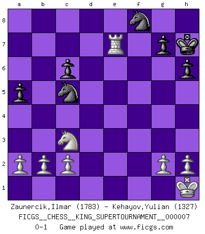 Last move : 0-1 2020 July 2 1:8:57 [Event "FICGS__CHESS__KING_SUPERTOURNAMENT__000007"] [Site "FICGS"] [Date "2020.04.16"] [Round "1"] [White "Zaunercik,Ilmar"] [Black "Kehayov,Yulian"] [Result "0-1"] [WhiteElo "1783"] [BlackElo "1327"] 1.e4 e5 2.f4 d6 3.fxe5 dxe5 4.Nf3 Nf6 5.Nc3 Be7 6.Bc4 h6 7.Nxe5 Be6 8.Bxe6 fxe6 9.O-O O-O 10.Ng6 Re8 11.d4 Nh7 12.Qf3 Nf8 13.Qf7+ Kh7 14.Nxe7 Rxe7 15.Qh5 Ng6 16.d5 exd5 17.Bg5 c6 18.Bxe7 Qxe7 19.exd5 Nd7 20.dxc6 bxc6 21.Rae1 Qc5+ 22.Kh1 Rf8 23.Qxc5 Nxc5 24.Rxf8 Nxf8 25.Re7 a5 0-1 This chess game has been lost on time (started : 2020.04.16 16:9:28) King's gambit Kingside Castling by player White (move 9) Kingside Castling by player Black (move 9) Player Black won this chess game. Follow this game move after move (download)If a ruler does not understand Chess, how can he rule over a kingdom ? (King Khusros II) Stelle das Brett so, daß die Sonne in die Augen deines Gegners scheint. (Ruy López) La batalla por la última verdad nunca sera ganada. Y es por eso que el Ajedrez es tan fascinante. (Hans Kmoch) Aux échecs, les retours au sommet sont rares : les dommages psychologiques consécutifs à une défaite sont trop sévères. (Daily Telegraph) All politicians must be presumed guilty until they are proven innocent. (Dinesh De Silva)