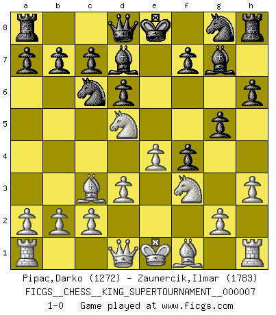 Last move : 1-0 2020 June 24 11:12:7 [Event "FICGS__CHESS__KING_SUPERTOURNAMENT__000007"] [Site "FICGS"] [Date "2020.04.16"] [Round "1"] [White "Pipac,Darko"] [Black "Zaunercik,Ilmar"] [Result "1-0"] [WhiteElo "1272"] [BlackElo "1783"] 1.e4 e5 2.f4 exf4 3.Nf3 d6 4.d3 g5 5.h3 Nc6 6.Nc3 Bg7 7.Bd2 Bd7 8.Nd5 h6 9.Bc3 1-0 This chess game has been lost on time (started : 2020.04.16 16:9:28) KGA : Fischer defense Player White won this chess game. Follow this game move after move (download)First-class players lose to second class players because second-class players sometimes play a first-class game. (Tarrasch) Der Schachmeister von Heute braucht Courage, einen Killerinstinkt, Ausdauer und Arroganz. (Larry Evans) Un entendimiento a fondo de las continuaciones típicas del mate, hace de las combinaciones de sacrificio mas complicadas conducirlas a ellas no solo sin dificultad, sino casi de una manera natural. (Siegbert Tarrasch) Un journaliste : 'Vous préférez avoir une dame de plus sur l'échiquier ou au lit ?' Boris Spassky : 'Ca dépend de la position.' The modern world has divided itself into Conservatives and Progressives. The business of Progressives is to go on making mistakes. The business of the Conservatives is to prevent the mistakes from being corrected. (G.K. Chesterton)