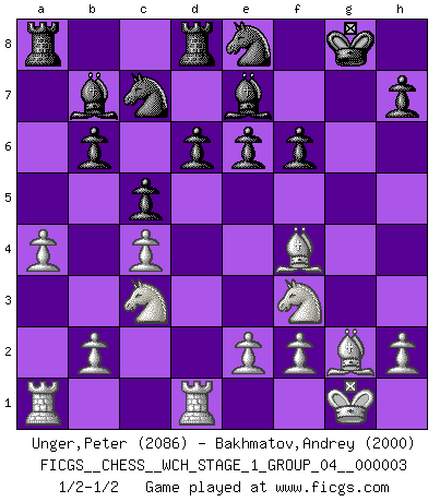 Last move : 1/2-1/2 2007 July 25 9:38:37 [Event "FICGS__CHESS__WCH_STAGE_1_GROUP_04__000003"] [Site "FICGS"] [Date "2007.07.11"] [Round "1"] [White "Unger,Peter"] [Black "Bakhmatov,Andrey"] [Result "1/2-1/2"] [WhiteElo "2086"] [BlackElo "2000"] 1.d4 Nf6 2.Nf3 b6 3.c4 e6 4.g3 Ba6 5.Qa4 c5 6.Bg2 Bb7 7.dxc5 bxc5 8.O-O Be7 9.Nc3 O-O 10.Rd1 Qb6 11.Bf4 d6 12.Qb3 Rd8 13.Qxb6 axb6 14.Nb5 Ne8 15.g4 Na6 16.g5 Nac7 17.Nc3 f5 18.gxf6 gxf6 19.a4 1/2-1/2 Queen's Indian defense Kingside Castling by player White (move 8) Kingside Castling by player Black (move 9) This chess game ended in a draw. Follow this game move after move (download)Pawns: they are the soul of this game, they alone form the attack and defense. (Philidor) Glücklicherweise sind Großmeister Ruben Fines reine Schachbücher weniger phallozentrisch [als seine Schachpsychologie] und deswegen auch weniger lächerlich. (Nigel Short) Una mala movida nulifica cuarenta buenas. (Horowitz) Le profane ne songe pas à la somme de jouissance dont il se prive, qui méconnaît ce jeu aux ressources aussi variées que passionnantes. (Jean-Marie Jeanton-Lamarche) I just play for fun. (Anna Kournikova)