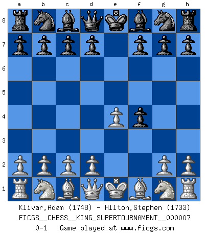Last move : 0-1 2020 May 17 2:29:2 [Event "FICGS__CHESS__KING_SUPERTOURNAMENT__000007"] [Site "FICGS"] [Date "2020.04.16"] [Round "1"] [White "Klivar,Adam"] [Black "Hilton,Stephen"] [Result "0-1"] [WhiteElo "1748"] [BlackElo "1733"] 1.e4 e5 2.f4 exf4 0-1 This chess game has been lost on time (started : 2020.04.16 16:9:28) King's gambit accepted Player Black won this chess game. Follow this game move after move (download)Chess problems demand from the composer the same virtues that characterize all worthwhile art: originality, invention, conciseness, harmony, complexity, and splendid insincerity. (Vladimir Nabokov) Wenn Du nicht kämpfst, um anderen etwas zu beweisen, sondern nur für Dich selbst, dann bist du fast unbesiegbar. (Garry Kasparov) ¿Quién es tu oponente esta tarde? Esta tarde mi oponente son las piezas negras. (Akiba Rubinstein) Lorsque vous vous retrouvez devant une position atroce, ne tendez pas un ultime piège dérisoire avec l'intention d'abandonner si l'adversaire le déjoue ! Faites-vous plutôt un devoir de résister comme si votre vie en dépendait. Jouez le coup qui vous déplairait au centuple si vous étiez dans la peau de votre tortionnaire ! I feel so... helpless. (C-3PO in Star Wars ep.3)