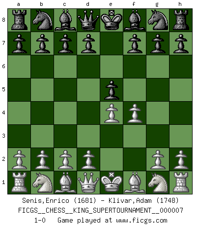 Last move : 1-0 2020 May 17 2:29:2 [Event "FICGS__CHESS__KING_SUPERTOURNAMENT__000007"] [Site "FICGS"] [Date "2020.04.16"] [Round "1"] [White "Senis,Enrico"] [Black "Klivar,Adam"] [Result "1-0"] [WhiteElo "1681"] [BlackElo "1748"] 1.e4 e5 2.f4 1-0 This chess game has been lost on time (started : 2020.04.16 16:9:28) King's gambit Player White won this chess game. Follow this game move after move (download)Why must I lose to this idiot ? (Aron Nimzovich) Man wirke der falschen Auffassung entgegen, als ob jeder Zug Unmittelbares zu leisten habe; auch Werte- und Ruhezüge haben ihre Existenzberechtigung. (Aaron Nimzowitsch) Hay dos clases de hombres: aquellos que se conforman en dejarse llevar por las circunstancias y que juegan barajas y aquellos decididos a controlar las circunstancias y que juegan al Ajedrez. (Mortimer Collins) Psychologiquement, tu dois avoir confiance en toi même, mais cette confiance doit être basée sur des faits. (Robert Fischer) I don't know, I don't care, and it doesn't make any difference. (Albert Einstein)