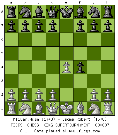 Last move : 0-1 2020 May 18 15:26:13 [Event "FICGS__CHESS__KING_SUPERTOURNAMENT__000007"] [Site "FICGS"] [Date "2020.04.16"] [Round "1"] [White "Klivar,Adam"] [Black "Csoma,Robert"] [Result "0-1"] [WhiteElo "1748"] [BlackElo "1670"] 1.e4 e5 2.f4 exf4 0-1 This chess game has been lost on time (started : 2020.04.16 16:9:28) King's gambit accepted Player Black won this chess game. Follow this game move after move (download)Chess is so inspiring that I do not believe a good player is capable of having an evil thought during the game. (Wilhelm Steinitz) Die unerbitterlichsten Regeln im Schach sind die Ausnahmen. (Savielly Grigorievitsch Tartakower) Cada Peón es potencialmente una Reina. (James Mason) Botvinnik disait en comparant les échecs à la musique: Il existe une science dont le but est l'étude de l'acoustique et des sons. Mais il y a aussi un art qui se sert de l'océan des sons : c'est la musique. De toute évidence, il en est de même pour la pensée. La logique est l'étude des lois de la réflexion et les échecs reflètent, en tant qu'art, le côté logique de la réflexion, sous la forme d'images artistiques... Extrait de Fischer - Spassky, Reykjavik 1972 par Alexander & F. Wyndham (Ed. Solar), p 37. A good aphorism is too hard for the tooth of time, and is not worn away with the centuries, although it serves as food for every speech. (Friedrich Nietzsche)