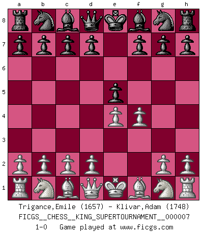 Last move : 1-0 2020 May 17 2:29:2 [Event "FICGS__CHESS__KING_SUPERTOURNAMENT__000007"] [Site "FICGS"] [Date "2020.04.16"] [Round "1"] [White "Trigance,Emile"] [Black "Klivar,Adam"] [Result "1-0"] [WhiteElo "1657"] [BlackElo "1748"] 1.e4 e5 2.f4 1-0 This chess game has been lost on time (started : 2020.04.16 16:9:28) King's gambit Player White won this chess game. Follow this game move after move (download)Chess, like love, is infectious at any age. (Flohr) Den Ruhm habe ich schon, jetzt brauche ich noch das Geld. (Wilhelm Steinitz) Hasta este punto, las blancas han seguido un análisis bien conocido. Pero ahora el hace un error fatal: empieza a usar su propia cabeza. (Siegbert Tarrasch) Les échecs sont plus proches de l'art de l'assassinat que de l'art de la guerre. (Arturo Perez-Reverte) Now the reason the enlightened prince and the wise general conquer the enemy whenever they move and their achievements surpass those of ordinary men is foreknowledge. (Sun Tzu)
