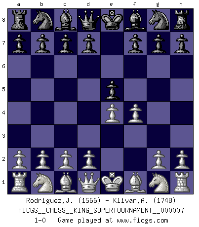 Last move : 1-0 2020 May 17 2:29:2 [Event "FICGS__CHESS__KING_SUPERTOURNAMENT__000007"] [Site "FICGS"] [Date "2020.04.16"] [Round "1"] [White "Rodriguez,Juan Antonio"] [Black "Klivar,Adam"] [Result "1-0"] [WhiteElo "1566"] [BlackElo "1748"] 1.e4 e5 2.f4 1-0 This chess game has been lost on time (started : 2020.04.16 16:9:28) King's gambit Player White won this chess game. Follow this game move after move (download)One of these modest little moves may be more embarrassing to your opponent than the biggest threat. (Siegbert Tarrasch) Schach ist mein Leben, meine Leidenschaft, was ich gelernt habe und seit meinem 14. Lebensjahr profimässig praktiziere. Darauf zu verzichten, würde mir sehr schwer fallen. (Viktor Kortschnoi) Cuando le juegas a Fischer, no es una cuestion de si vas a ganar o perder. Es una cuestion de si vas a sobrevivir. (Boris Spassky) Il vaut mieux sacrifier les pièces de l'adversaire. (Xavier Tartacover) Think like a man of action, act like a man of thought. (Henri Louis Bergson)