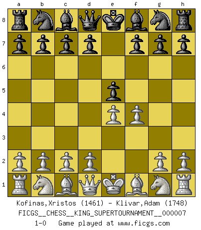 Last move : 1-0 2020 May 17 2:29:2 [Event "FICGS__CHESS__KING_SUPERTOURNAMENT__000007"] [Site "FICGS"] [Date "2020.04.16"] [Round "1"] [White "Kofinas,Xristos"] [Black "Klivar,Adam"] [Result "1-0"] [WhiteElo "1461"] [BlackElo "1748"] 1.e4 e5 2.f4 1-0 This chess game has been lost on time (started : 2020.04.16 16:9:28) King's gambit Player White won this chess game. Follow this game move after move (download)Could we look into the head of a Chess player, we should see there a whole world of feelings, images, ideas, emotion and passion. (Alfred Binet) Es ist besser die Steine des Gegners zu opfern. (Savielly Grigorievitsch Tartakower) No hay precio que sea tan grande por la cabellera del Rey enemigo. (Koblentz) Shah mat. Le roi est mort. Cri de fierté d'un joueur venant de terrasser son adversaire, courtoisement, sans effusion de sang. Men should grow up. - Yeah. And dogs should stop licking themselves. It's not gonna happen. (Gregory House to Dr. Cameron, House M.D.)