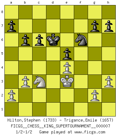 Last move : 1/2-1/2 2020 June 1 21:0:28 [Event "FICGS__CHESS__KING_SUPERTOURNAMENT__000007"] [Site "FICGS"] [Date "2020.04.16"] [Round "1"] [White "Hilton,Stephen"] [Black "Trigance,Emile"] [Result "1/2-1/2"] [WhiteElo "1733"] [BlackElo "1657"] 1.e4 e5 2.f4 Bc5 3.Nf3 d6 4.c3 Nf6 5.d4 Bb6 6.fxe5 dxe5 7.Bd3 exd4 8.cxd4 O-O 9.O-O Bxd4+ 10.Kh1 Ng4 11.Nxd4 Qxd4 12.Qe2 Be6 13.Nc3 c6 14.h3 Ne5 15.Bc2 Bc4 16.Qf2 Qxf2 17.Rxf2 Nbd7 18.Bf4 f6 19.Rd1 Rad8 20.Rfd2 Be6 21.Bb3 Kf7 22.Bxe5 fxe5 23.Kg1 Ke7 24.Bxe6 Kxe6 25.Na4 Ke7 26.Nc3 Nf6 27.Rxd8 Rxd8 28.Rxd8 Kxd8 29.Kf2 Kd7 30.Ke3 Kd6 31.b3 b6 1/2-1/2 KGD : Classical, 4.c3 Kingside Castling by player Black (move 8) Kingside Castling by player White (move 9) This chess game ended in a draw. Follow this game move after move (download)In Chess, just as in life, today's bliss may be tomorrow's poison. (Assaic) Verschiedene, sehr schätzbare und im Laufe des Lebens nützliche Eigenschaften des Geistes können durch das Schachspiel erworben und gekräftigt werden, so dass sie zu Gewohnheiten werden, die uns nie im Stich lassen. (Benjamin Franklin) Algunos sacrificios son sólidos, los demás son míos. (Mikhail Tal) Même un GMI sait rarement calculer sur plus de cinq coups une attaque à sacrifices. (Rudolf Spielmann) There is a great deal of difference between an eager man who wants to read a book and a tired man who wants a book to read. (G.K. Chesterton)