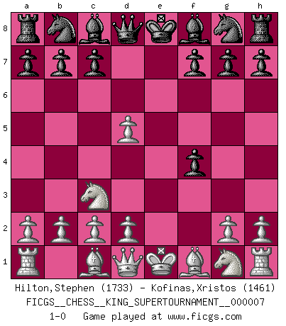 Last move : 1-0 2020 May 30 18:19:24 [Event "FICGS__CHESS__KING_SUPERTOURNAMENT__000007"] [Site "FICGS"] [Date "2020.04.16"] [Round "1"] [White "Hilton,Stephen"] [Black "Kofinas,Xristos"] [Result "1-0"] [WhiteElo "1733"] [BlackElo "1461"] 1.e4 e5 2.f4 d5 3.exd5 exf4 4.Nc3 1-0 This chess game has been lost on time (started : 2020.04.16 16:9:28) KGD : Falkbeer counter-gambit Player White won this chess game. Follow this game move after move (download)Bobby just drops the pieces and they fall on the right squares. (Miguel Najdorf) Ich bewundere Kasparows phantasievolle Angriffssiege aus den Achtzigern und Neunzigern, aber wenn man sie mit dem Computer überprüft, nimmt der Computer in jeder zweiten Partie die Opfer an, verteidigt sich und gewinnt. (Vladimir Kramnik) Los problemas de Ajedrez exigen del compositor las mismas virtudes que caracterizan todo el arte de valor: originalidad, invención, concisión, armonía, complejidad e insinceridad explendida. (Vladimir Nabokov) Je ne suis pas le dernier à jouer lâchement des coups douteux pendant le zeïtnot de l'adversaire pour l'achever: en effet les coups qui font le plus peur sont ceux que l'on ne comprend pas. Je me fais souvent peur quand je joue. (Un professeur anonyme) As the days dwindle down... to a precious few. (Maxwell Anderson)