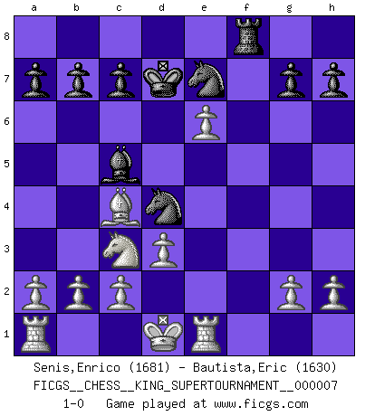 Last move : 1-0 2020 June 2 23:55:24 [Event "FICGS__CHESS__KING_SUPERTOURNAMENT__000007"] [Site "FICGS"] [Date "2020.04.16"] [Round "1"] [White "Senis,Enrico"] [Black "Bautista,Eric"] [Result "1-0"] [WhiteElo "1681"] [BlackElo "1630"] 1.e4 e5 2.f4 d5 3.exd5 Qxd5 4.Nc3 Qd8 5.fxe5 Bc5 6.Nf3 Bg4 7.Bc4 Nc6 8.d3 Nd4 9.Bg5 Qxg5 10.Nxg5 Bxd1 11.Kxd1 Kd7 12.Nxf7 Ne7 13.Nxh8 Rxh8 14.Re1 Rf8 15.e6+ 1-0 This chess game has been lost on time (started : 2020.04.16 16:9:28) KGD : Falkbeer counter-gambit Player White won this chess game. Follow this game move after move (download)Chess is the art of analysis. (Mikhail Botvinnik) Nicht daß Diemer aus Opportunismus Mitglied der NSDAP geworden wäre. Er war ein Fanatiker, in allem, was er tat. (Hans Ree) El Ajedrez es en su esencia, un juego. En su forma, un arte. Y en su ejecución, una ciencia. (Baron Tassilo) J'ai toujours senti une vague pitié pour l'homme qui ne connaît rien aux échecs, tout comme j'en aurais pour un homme ignorant de l'amour. Les Echecs, comme la musique ou comme l'amour, ont le pouvoir de rendre heureux. (Siegbert Tarrasch) I don't believe in psychology. I believe in good moves. (Bobby Fischer)