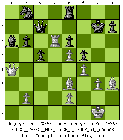 Last move : 1-0 2007 August 13 2:17:32 [Event "FICGS__CHESS__WCH_STAGE_1_GROUP_04__000003"] [Site "FICGS"] [Date "2007.07.11"] [Round "1"] [White "Unger,Peter"] [Black "d Ettorre,Rodolfo"] [Result "1-0"] [WhiteElo "2086"] [BlackElo "1596"] 1.d4 Nf6 2.Nf3 d5 3.c4 e6 4.g3 dxc4 5.Bg2 c5 6.O-O Nc6 7.Ne5 Nxe5 8.dxe5 Nd7 9.Na3 Be7 10.Nxc4 O-O 11.Qc2 Rb8 12.Rd1 Qc7 13.a4 b6 14.Nd6 Ba6 15.f4 Rbd8 16.Be3 g5 17.Be4 f5 18.Bf3 g4 19.Bg2 Bxd6 20.Rxd6 Rfe8 21.a5 Nb8 22.axb6 axb6 23.Rad1 Rxd6 24.Rxd6 Kf7 25.h3 gxh3 26.Bxh3 Kg7 27.Qa4 1-0 Queen's pawn game Kingside Castling by player White (move 6) Kingside Castling by player Black (move 10) Player White won this chess game. Follow this game move after move (download)Chess, like love, is infectious at any age. (Flohr) Frage: Was machen Sie mit den Preisen? Anwort: Ich habe Angst, dass meine Freundin davon neue Kleider kauft. (Loek van Wely) El Ajedrez es despiadado: debes de estar preparado para matar gente. (Nigel Short) 'L'échange des dames est un coup dur pour les deux adversaires...' Un journaliste lors d'une partie du match Spassky-Fischer It's not the size of the dog in the fight, it's the size of the fight in the dog. (Mark Twain)