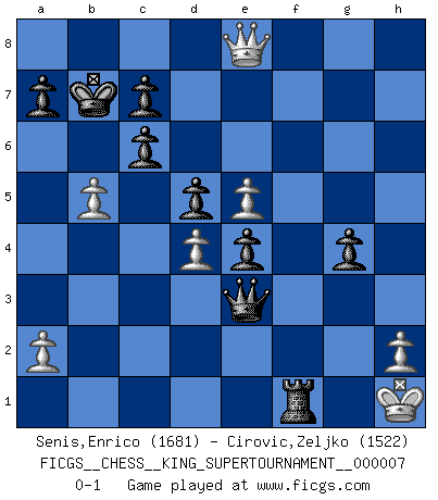 Last move : 0-1 2020 May 18 16:39:19 [Event "FICGS__CHESS__KING_SUPERTOURNAMENT__000007"] [Site "FICGS"] [Date "2020.04.16"] [Round "1"] [White "Senis,Enrico"] [Black "Cirovic,Zeljko"] [Result "0-1"] [WhiteElo "1681"] [BlackElo "1522"] 1.e4 e5 2.f4 exf4 3.Nf3 d5 4.e5 Nc6 5.d4 Bg4 6.Bb5 Bxf3 7.Qxf3 Qh4+ 8.Ke2 O-O-O 9.Bxc6 bxc6 10.Bxf4 Qe7 11.c3 h6 12.b4 Nf6 13.Kf2 Ne4+ 14.Kg1 g5 15.Be3 h5 16.g3 g4 17.Qe2 Bh6 18.Bxh6 Rxh6 19.Qe3 Rdh8 20.Nd2 f5 21.Kg2 h4 22.Nxe4 fxe4 23.Qe2 Qe6 24.Raf1 hxg3 25.Kxg3 Rh3+ 26.Kg2 Qg6 27.Qa6+ Kd8 28.Rf6 Qg5 29.Qf1 Rxc3 30.Rf8+ Rxf8 31.Qxf8+ Kd7 32.Qf7+ Kc8 33.Rf1 Rf3 34.Qe8+ Kb7 35.b5 Qd2+ 36.Kg1 Qe3+ 37.Kh1 Rxf1+ 0-1 KGA : Abbazia defense (Classical defense, Modern defense!) Queenside Castling by player Black (move 8) Player Black won this chess game. Follow this game move after move (download)A thorough understanding of the typical mating continuations makes the most complicated sacrificial combinations leading up to them not only not difficult, but almost a matter of course. (Siegbert Tarrasch) Ich hatte Zahnschmerzen im ersten Spiel. In der zweiten Partie tat mir der Kopf weh. In der dritten war es eine Rheuma-Attacke und während der vierten fühlte ich mich nicht gut. Und in der fünften? Nun, man muss doch nicht jedes Spiel gewinnen, oder? (Savielly Grigorievitsch Tartakower) El hombre es un frívolo, una creatura engañosa y como un jugador de Ajedrez, se preocupa mas por el proceso de obtener su meta que de la meta por sí misma. (Dostoyevsky) Ce qui caractérise les parties de combat, c'est que si le défenseur a constamment de difficiles problèmes à résoudre, l'attaquant doit chercher sans relâche de nouvelles possibilités d'attaque. (Koblentz) Once you start thinking you have nothing left to learn, you have everything to learn. (Steve Badget)