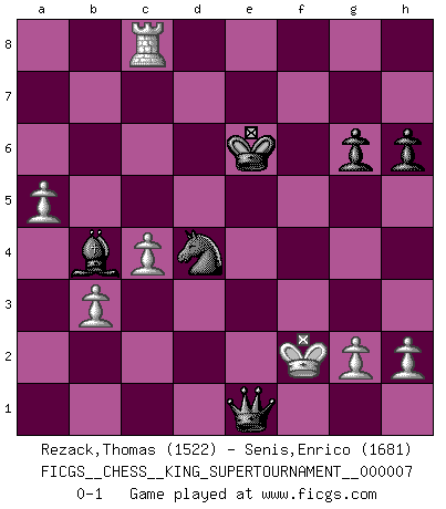 Last move : 0-1 2020 May 24 12:38:4 [Event "FICGS__CHESS__KING_SUPERTOURNAMENT__000007"] [Site "FICGS"] [Date "2020.04.16"] [Round "1"] [White "Rezack,Thomas"] [Black "Senis,Enrico"] [Result "0-1"] [WhiteElo "1522"] [BlackElo "1681"] 1.e4 e5 2.f4 exf4 3.Nf3 d6 4.Bc4 h6 5.d4 Nf6 6.Nc3 Be7 7.Bxf4 O-O 8.O-O Bg4 9.Qd3 Nc6 10.Rae1 Qd7 11.e5 Nh5 12.Be3 Be6 13.d5 Nxe5 14.Nxe5 dxe5 15.dxe6 Qxd3 16.Bxd3 a6 17.exf7+ Rxf7 18.Bc4 Raf8 19.Bxf7+ Rxf7 20.Rxf7 Kxf7 21.Rd1 Bd6 22.Ne4 Bb4 23.c3 Be7 24.Rd7 Nf6 25.Rxc7 Nd5 26.Nd6+ Ke6 27.Rxb7 Bxd6 28.c4 Nxe3 29.b3 g6 30.Rb6 Kd7 31.Rxa6 Nc2 32.Ra7+ Ke6 33.Ra6 Nb4 34.Ra8 e4 35.a3 Nc2 36.a4 Bc5+ 37.Kf1 e3 38.a5 Nd4 39.Rc8 e2+ 40.Ke1 Bb4+ 41.Kf2 e1Q+ 0-1 KGA : Fischer defense Kingside Castling by player Black (move 7) Kingside Castling by player White (move 8) Promotion Queen by player Black (move 41) Player Black won this chess game. Follow this game move after move (download)I know people who have all the will in the world, but still can't play good Chess. (Bobby Fischer) Ich war zu klein für die Schach-Schülermannschaft! (Woody Allen) En la perfecta combinación de Ajedrez como en una historia corta de primera clase, toda la trama y contra trama deberá conducir hacia un final sorprendente, el interes no es mitigado hasta el último momento. (Yates and Winter) Toutes choses étant égales, c'est la conviction qui gagne. Alliée à une volonté de vaincre, elle sert de détonateur, suscite des idées, disperse les doutes et aide à penser clairement. (Robert Fischer) Nowadays, anyone who cannot speak English and is incapable of using the Internet is regarded as backward. (Al-Waleed bin Talal)