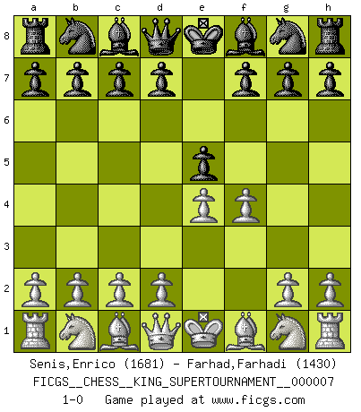 Last move : 1-0 2020 May 17 2:29:2 [Event "FICGS__CHESS__KING_SUPERTOURNAMENT__000007"] [Site "FICGS"] [Date "2020.04.16"] [Round "1"] [White "Senis,Enrico"] [Black "Farhad,Farhadi"] [Result "1-0"] [WhiteElo "1681"] [BlackElo "1430"] 1.e4 e5 2.f4 1-0 This chess game has been lost on time (started : 2020.04.16 16:9:28) King's gambit Player White won this chess game. Follow this game move after move (download)A win by an unsound combination, however showy, fills me with artistic horror. (Wilhelm Steinitz) Sehr viele beherrschen heutzutage das große Einmalseins des Schachspiels und kennen sogar dessen Logarithmentafeln auswendig - deshalb sollte man hin und wieder zu beweisen trachten, dass zwei mal zwei auch fünf sein kann. (Mikhail Nekhemyevich Tal) El sobresalir en el Ajedrez es un signo de una mente intrigante. (Sir Arthur Conan Doyle) On a dit que l'homme se distingue de l'animal par le fait qu'il achète plus de livres qu'il ne peut en lire. Je voudrais suggérer qu'inclure à la liste des livres quelques livres d'échecs rendrait la distinction manifeste. (Edward Lasker) Empty your mind, be formless, shapeless — like water. (Bruce Lee)