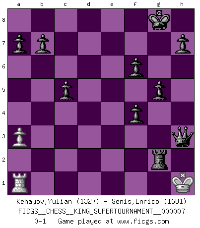 Last move : 0-1 2020 May 20 22:41:15 [Event "FICGS__CHESS__KING_SUPERTOURNAMENT__000007"] [Site "FICGS"] [Date "2020.04.16"] [Round "1"] [White "Kehayov,Yulian"] [Black "Senis,Enrico"] [Result "0-1"] [WhiteElo "1327"] [BlackElo "1681"] 1.e4 e5 2.f4 d5 3.Qf3 Nc6 4.exd5 Nd4 5.Qd3 Bf5 6.Qc3 Nxc2+ 7.Qxc2 Bxc2 8.Nc3 Nf6 9.d3 Bb4 10.Bd2 Bxc3 11.Bxc3 exf4 12.Nf3 O-O 13.Be2 Nxd5 14.O-O Nxc3 15.bxc3 Bxd3 16.Bxd3 Qxd3 17.Rac1 Rfe8 18.h3 Rad8 19.Kh2 f6 20.Kg1 g5 21.Kh1 c5 22.Kg1 Qc4 23.Kh1 Rd3 24.Kg1 Rxc3 25.Rxc3 Qxc3 26.Kh2 Re2 27.Kg1 Qc2 28.Kh1 Rxg2 29.a3 Qe2 30.Re1 Qxf3 31.Ra1 Qxh3+ 0-1 KGD : Falkbeer counter-gambit Kingside Castling by player Black (move 12) Kingside Castling by player White (move 14) Player Black won this chess game. Follow this game move after move (download)You sit at the board and suddenly your heart leaps. Your hand trembles to pick up the piece and move it. But what Chess teaches you is that you must sit there calmly and think about whether it's really a good idea and whether there are other better ideas. (Stanley Kubrick) Schach sollte überall auf der Welt Schulfach werden. Es fördert die geistige Auseinandersetzung. Es lehrt die Demut in der Niederlage. (Garry Kasparov) Todos los jugadores de Ajedrez deberían tener un pasatiempo. (Savielly Tartakower) Plusieurs personnes se sont demandées comment Tal faisait pour gagner... En fait, c'est très simple ! Il met ses pièces au centre de l'échiquier et les sacrifie quelque part ! (David Bronstein) The leaves of memory seemed to make a mournful rustling in the dark. (Henry Wadsworth Longfellow)