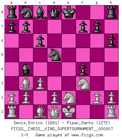 Last move : 1-0 2020 May 25 19:18:42 [Event "FICGS__CHESS__KING_SUPERTOURNAMENT__000007"] [Site "FICGS"] [Date "2020.04.16"] [Round "1"] [White "Senis,Enrico"] [Black "Pipac,Darko"] [Result "1-0"] [WhiteElo "1681"] [BlackElo "1272"] 1.e4 e5 2.f4 exf4 3.Nf3 h6 4.Bc4 c6 5.Nc3 Bb4 6.Ne2 d5 7.Bb3 Nf6 8.exd5 Nxd5 9.c3 1-0 This chess game has been lost on time (started : 2020.04.16 16:9:28) KGA : Becker defense Player White won this chess game. Follow this game move after move (download)The hardest game to win is a won game. (Emanuel Lasker) Mein Gehirn das ist mein zweitwichtigstes Organ [Aus dem Film: Der Schläfer]. (Woody Allen) Las piezas de Ajedrez son los bloques del alfabeto que moldean los pensamientos; y esos pensamientos, aunque hagan un diseño visual en el tablero, expresan abstractamente su belleza como un poema. (Marcel Duchamp) Aux échecs, l'amour-propre est satisfait quand on remporte la victoire, mais il n'y a pas de honte à être battu. (Benjamin Franklin) Warrior pose battles inner weakness and wins focus. You see that there is no war within you. You're on your own side, and you are your own strength. (Terri Guillemets)