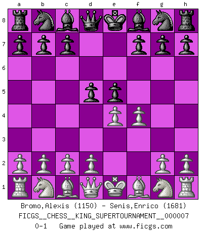 Last move : 0-1 2020 May 17 2:29:2 [Event "FICGS__CHESS__KING_SUPERTOURNAMENT__000007"] [Site "FICGS"] [Date "2020.04.16"] [Round "1"] [White "Bromo,Alexis"] [Black "Senis,Enrico"] [Result "0-1"] [WhiteElo "1150"] [BlackElo "1681"] 1.e4 e5 2.f4 d5 0-1 This chess game has been lost on time (started : 2020.04.16 16:9:28) KGD : Falkbeer counter-gambit Player Black won this chess game. Follow this game move after move (download)Chess is like war on a board. (Bobby Fischer) Der Verteidiger gebe der Gewalt nach, aber nur der Gewalt. Er schaffe sich nicht freiwillig, etwa aus Blindheit oder aus Schrecken, irgendwelche Schwächen. Er lasse sich nicht bluffen. (Emanuel Lasker) Fischer era un maestro de claridad y un Rey del posicionamiento astuto. Sus oponentes podían ver hacia donde se dirigía pero eran impotentes para detenerlo. (Bruce Pandolfini) Il n'y a pas eu de défaite parce que je ne crois pas que cet ordinateur ait jamais existé. IBM a triché en refusant d'imprimer les modes de recherche de la machine. C'est évident, pendant le match, des coups décisifs ont été joués par des êtres humains. Aujourd'hui, les meilleurs spécialistes en informatique ne peuvent toujours pas expliquer comment Deep-Blue a pu jouer contre la logique des ordinateurs. IBM a gagné une guerre de communication, mais ils sont incapables de prouver que l'ordinateur a gagné tout seul. (Garry Kasparov) It is the aim of the modern school, not to treat every position according to one general law, but according to the principle inherent in the position. (Richard Reti)