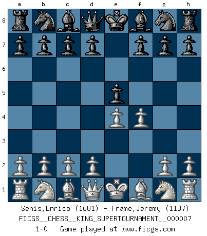 Last move : 1-0 2020 May 17 2:29:2 [Event "FICGS__CHESS__KING_SUPERTOURNAMENT__000007"] [Site "FICGS"] [Date "2020.04.16"] [Round "1"] [White "Senis,Enrico"] [Black "Frame,Jeremy"] [Result "1-0"] [WhiteElo "1681"] [BlackElo "1137"] 1.e4 e5 2.f4 1-0 This chess game has been lost on time (started : 2020.04.16 16:9:28) King's gambit Player White won this chess game. Follow this game move after move (download)The passed pawn is a criminal, who should be kept under lock and key. Mild measures, such as police surveillance, are not sufficient. (Nimzovitch) Ich hatte meine größten Erfolge, als ich 47 Jahre alt war. Kasparow war noch nicht mal 42 und hat das Schach schon im Stich gelassen. (Viktor Kortschnoi) Los tropiezos estan todos ahí en el tablero, esperando que se cometan. (Savielly Tartakover) Mon pion favori sur ma case favorite ! Bronstein en parlant d'un coup de pion en h5 quand il avait les Noirs. To send light into the darkness of men's hearts - such is the duty of the artist. (Schumann)