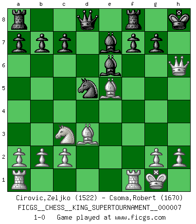 Last move : 1-0 2020 May 8 20:40:16 [Event "FICGS__CHESS__KING_SUPERTOURNAMENT__000007"] [Site "FICGS"] [Date "2020.04.16"] [Round "1"] [White "Cirovic,Zeljko"] [Black "Csoma,Robert"] [Result "1-0"] [WhiteElo "1522"] [BlackElo "1670"] 1.e4 e5 2.f4 exf4 3.Nf3 d6 4.d4 Nf6 5.Bxf4 Be7 6.Nc3 O-O 7.e5 dxe5 8.Nxe5 Nbd7 9.Bd3 Kh8 10.O-O Nxe5 11.Bxe5 Be6 12.d5 Nxd5 13.Qh5 h6 14.Qxh6+ 1-0 KGA : Fischer defense Kingside Castling by player Black (move 6) Kingside Castling by player White (move 10) Player White won this chess game. Follow this game move after move (download)You know, comrade Pachman, I don't enjoy being a Minister, I would rather play Chess like you. (Che Guevara) Ich habe die Schachforschung dermaßen betrieben, dass sie auf eine wissenschaftliche Basis gestellt wurde. (Mikhail Moiseyevich Botvinik) El Ajedrez es un cuento de Hadas de las 1001 metidas de pata. (Savielly Tartakower) Des idées, des idées, j'en ai cent, j'en ai mille. Des bonnes, des mauvaises, applicables, irréalisables... Il suffit de faire le tri ! (Roos) Life is pain my dear and anyone who says otherwise is selling something. (Princess Bride)