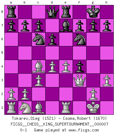 Last move : 0-1 2020 May 31 7:27:7 [Event "FICGS__CHESS__KING_SUPERTOURNAMENT__000007"] [Site "FICGS"] [Date "2020.04.16"] [Round "1"] [White "Tokarev,Oleg"] [Black "Csoma,Robert"] [Result "0-1"] [WhiteElo "1521"] [BlackElo "1670"] 1.e4 e5 2.f4 exf4 3.Nf3 d6 4.Bc4 Bg4 5.O-O Be7 6.d4 Nf6 7.Re1 O-O 8.h3 Bxf3 9.Qxf3 Nc6 10.c3 Re8 0-1 This chess game has been lost on time (started : 2020.04.16 16:9:28) KGA : Fischer defense Kingside Castling by player White (move 5) Kingside Castling by player Black (move 7) Player Black won this chess game. Follow this game move after move (download)If one piece is badly posted, the whole game is bad. (Tarrasch) Ivan Sokolov treibt mich als Beifahrer an mit go Loeky go - . (Loek van Wely) Personalmente, yo prefiero mirar hacia el futuro en donde un programa de computadora gane el título mundial de Ajedrez. La humanidad necesita una lección de humildad. (Richard Dawkings) Les Echecs sont et restent toujours un combat, un combat intégral comme la boxe, la lutte ou un autre sport, et où il doit y avoir un vainqueur et un vaincu. (Joseph Emil Diemer) A clear conscience is usually the sign of a bad memory. (Unknown)
