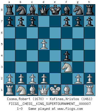 Last move : 1-0 2020 May 19 17:5:30 [Event "FICGS__CHESS__KING_SUPERTOURNAMENT__000007"] [Site "FICGS"] [Date "2020.04.16"] [Round "1"] [White "Csoma,Robert"] [Black "Kofinas,Xristos"] [Result "1-0"] [WhiteElo "1670"] [BlackElo "1461"] 1.e4 e5 2.f4 exf4 3.Nf3 d5 4.exd5 1-0 This chess game has been lost on time (started : 2020.04.16 16:9:28) KGA : Abbazia defense (Classical defense, Modern defense!) Player White won this chess game. Follow this game move after move (download)Fischer is completely natural. He plays no roles. He's like a child. Very, very simple. (Zita Rajcsanyi) Schach ist ein Reich, wo sich die menschliche Phantasie frei entfalten kann. (David Bronstein) El Ajedrez es imaginación. (David Bronstein) Les échecs, c'est l'art d'analyser. (Mikhail Botvinnik) It is not enough to be a good player... you must also play well. (Siegbert Tarrasch)