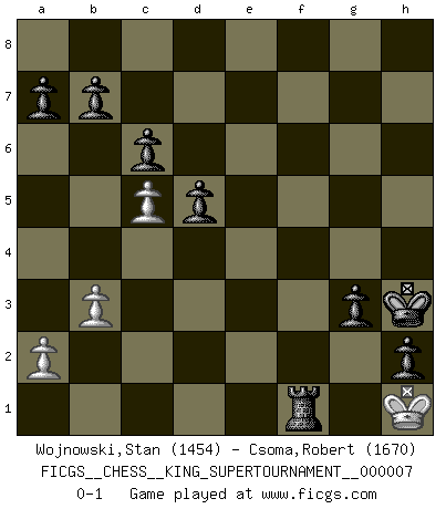 Last move : 0-1 2020 June 10 16:30:40 [Event "FICGS__CHESS__KING_SUPERTOURNAMENT__000007"] [Site "FICGS"] [Date "2020.04.16"] [Round "1"] [White "Wojnowski,Stan"] [Black "Csoma,Robert"] [Result "0-1"] [WhiteElo "1454"] [BlackElo "1670"] 1.e4 e5 2.f4 exf4 3.Nf3 d6 4.Bc4 Bg4 5.O-O Nf6 6.Nc3 Be7 7.d4 O-O 8.Bxf4 Nxe4 9.Nd5 Nc6 10.Nxe7+ Qxe7 11.h3 Bh5 12.Re1 Kh8 13.Bd5 f5 14.g4 Bg6 15.Nh4 Qxh4 16.Qf3 Nxd4 17.Qd3 Nc6 18.gxf5 Qxf4 19.Bxe4 Bxf5 20.Bxf5 Rxf5 21.Rf1 Qg5+ 22.Kh2 Rxf1 23.Rxf1 Ne5 24.Qe2 c6 25.Qf2 h6 26.Rg1 Qe7 27.Qg3 Rf8 28.h4 Nf3+ 29.Kh1 Nxg1 30.Qxg1 Qxh4+ 31.Kg2 Qg5+ 32.Kh1 Qxg1+ 33.Kxg1 Kh7 34.Kg2 d5 35.Kg3 g5 36.Kg4 Kg6 37.b3 h5+ 38.Kg3 h4+ 39.Kg4 Rf4+ 40.Kh3 Kh5 41.Kg2 g4 42.Kh2 h3 43.Kg3 Rf3+ 44.Kh2 Kh4 45.Kg1 g3 46.c4 h2+ 47.Kh1 Kh3 48.c5 Rf1+ 0-1 KGA : Fischer defense Kingside Castling by player White (move 5) Kingside Castling by player Black (move 7) Player Black won this chess game. Follow this game move after move (download)A good player is always lucky. (Jose Raul Capablanca) Der 70jährige Viktor Kortschnoi: Die Rentenanstalt wollte mich zwingen in Rente zu gehen. Meine Frau erhält jetzt eine Pension- und ich zahle weiter in die Rentenkasse ein! (Viktor Kortschnoi) En el Ajedrez, tal como es jugado por los Maestros, practicamente la suerte es eliminada. (Emanuel Lasker) Pour moi, les échecs ne sont pas un jeu mais un art. (Alexandre Alekhine) Wikichess, chess moves explained by 'experimented' players. (Thibault de Vassal)