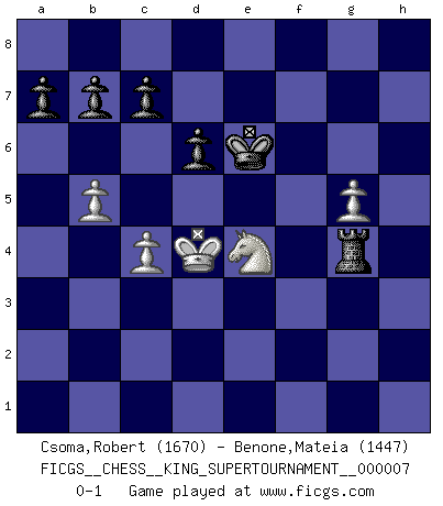Last move : 0-1 2020 July 23 14:11:17 [Event "FICGS__CHESS__KING_SUPERTOURNAMENT__000007"] [Site "FICGS"] [Date "2020.04.16"] [Round "1"] [White "Csoma,Robert"] [Black "Benone,Mateia"] [Result "0-1"] [WhiteElo "1670"] [BlackElo "1447"] 1.e4 e5 2.f4 exf4 3.Nf3 g5 4.Bc4 g4 5.Ne5 Qh4+ 6.Kf1 Nh6 7.d4 d6 8.Nd3 f3 9.Bf4 Nc6 10.c3 Bd7 11.Nd2 fxg2+ 12.Kxg2 Qh3+ 13.Kg1 Na5 14.Nf2 Qh4 15.Bg3 Qg5 16.Be2 O-O-O 17.b4 Nc6 18.a4 Ne7 19.c4 f5 20.exf5 Nhxf5 21.Nde4 Qe3 22.Bxg4 h5 23.Bxh5 Nxd4 24.Kg2 Bg7 25.Re1 Qh6 26.Bg4 Ndf5 27.Ra3 Nxg3 28.Bxd7+ Rxd7 29.hxg3 Qh2+ 30.Kf1 Nc6 31.b5 Nd4 32.Rd3 Rf7 33.Rxd4 Qh1+ 34.Ke2 Qf3+ 35.Kd2 Qxd1+ 36.Kxd1 Bxd4 37.Re2 Rf3 38.g4 Rh2 39.Ke1 Ra3 40.g5 Rxa4 41.Rc2 Kd7 42.Ke2 Ke6 43.Kd3 Bxf2 44.Rxf2 Ra3+ 45.Kd4 Rxf2 46.Nxf2 Rg3 47.Ne4 Rg4 0-1 KGA : Salvio gambit, Anderssen counter-attack Queenside Castling by player Black (move 16) Player Black won this chess game. Follow this game move after move (download)Chess is above all, a fight ! (Emanuel Lasker) Man gibt nur Pakete auf. (Paul Keres) Nunca nadie ha ganado una partida de Ajedrez rindiendose. (Unknown) Les Echecs, c'est l'art de la guerre sans les charniers, c'est la résurrection des morts tombés au champ d'honneur, l'espoir perpétuel, la suprématie de l'intelligence sur la force, la culture de l'esprit. (F. Szpiner) The human is the only animal species whose members are able to talk themselves into difficulties that would not otherwise exist. (Wendell Johnson)