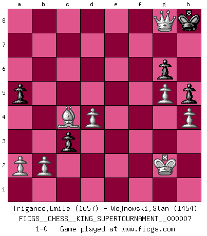 Last move : 1-0 2020 June 1 14:54:54 [Event "FICGS__CHESS__KING_SUPERTOURNAMENT__000007"] [Site "FICGS"] [Date "2020.04.16"] [Round "1"] [White "Trigance,Emile"] [Black "Wojnowski,Stan"] [Result "1-0"] [WhiteElo "1657"] [BlackElo "1454"] 1.e4 e5 2.f4 exf4 3.Bc4 Qh4+ 4.Kf1 Nf6 5.Nc3 Ng4 6.Nh3 Nc6 7.d4 Bb4 8.Nd5 Ba5 9.Bxf4 O-O 10.Bg3 Qh6 11.Nf2 Ne3+ 12.Nxe3 Qxe3 13.c3 Ne7 14.Qe2 Qh6 15.Ng4 Qg5 16.Ne3 c6 17.Qf2 b5 18.Bf4 Qg6 19.Bd3 Re8 20.Rd1 d6 21.e5 Nf5 22.Nxf5 Bxf5 23.Bxf5 Qh5 24.g4 Qh3+ 25.Kg1 g6 26.Rd3 Qxd3 27.Bxd3 dxe5 28.Bxe5 Bb6 29.Qh4 Rxe5 30.Kg2 Re3 31.Rd1 Rae8 32.Qf6 Bd8 33.Qf2 Bg5 34.h4 Bd8 35.Bf1 Bc7 36.Rd3 R3e4 37.Kh3 Rf4 38.Rf3 R8e4 39.Rxf4 Rxf4 40.Qe2 h5 41.g5 Rg4 42.Qe7 Rg3+ 43.Kh2 Re3 44.Qxc7 Rf3 45.Kg2 Rd3 46.Bxd3 a5 47.Qxc6 b4 48.Bc4 bxc3 49.Qe8+ Kg7 50.Qxf7+ Kh8 51.Qg8+ 1-0 KGA : Bishop's gambit Kingside Castling by player Black (move 9) Player White won this chess game. Follow this game move after move (download)Don't even mention losing to me. I can't stand to think of it. (Bobby Fischer) Auf jeden Fall musst du zuerst Rechtsanwalt werden, damit du deine eigenen Interessen und die deiner Familie vertreten kannst. [Brief an seinen Sohn] (José Raúl Capablanca) El Ajedrez es imaginación. (David Bronstein) La tactique est l'élément le plus important du milieu de jeu. (Siegbert Tarrasch) Players are not good because they find tactics, it is about the way to find the positions in which those tactics are hidden. (Luc-Olivier Leclerc)