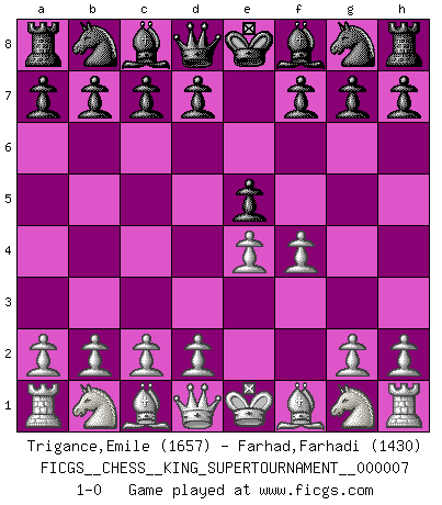 Last move : 1-0 2020 May 17 2:29:2 [Event "FICGS__CHESS__KING_SUPERTOURNAMENT__000007"] [Site "FICGS"] [Date "2020.04.16"] [Round "1"] [White "Trigance,Emile"] [Black "Farhad,Farhadi"] [Result "1-0"] [WhiteElo "1657"] [BlackElo "1430"] 1.e4 e5 2.f4 1-0 This chess game has been lost on time (started : 2020.04.16 16:9:28) King's gambit Player White won this chess game. Follow this game move after move (download)Chess is the gymnasium of the mind. (Blaise Pascal) Obwohl ich vom Stil her kaum zu den Priestern der Schachkunst gezählt werde, halte ich Schach doch für eine Kunst. (Tigran Petrosjan) Nunca nadie ha ganado una partida de Ajedrez rindiendose. (Unknown) Des idées, des idées, j'en ai cent, j'en ai mille. Des bonnes, des mauvaises, applicables, irréalisables... Il suffit de faire le tri ! (Roos) The right perception of any matter and a misunderstanding of the same matter do not wholly exclude each other. (Kafka's the trial)