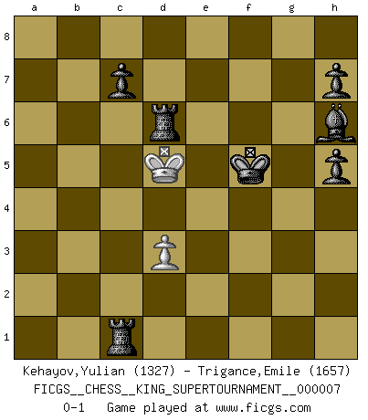 Last move : 0-1 2020 June 5 17:6:3 [Event "FICGS__CHESS__KING_SUPERTOURNAMENT__000007"] [Site "FICGS"] [Date "2020.04.16"] [Round "1"] [White "Kehayov,Yulian"] [Black "Trigance,Emile"] [Result "0-1"] [WhiteElo "1327"] [BlackElo "1657"] 1.e4 e5 2.f4 Bc5 3.fxe5 Qh4+ 4.g3 Qxe4+ 5.Qe2 Qxh1 6.Nf3 Kf8 7.Qg2 Qxg2 8.Bxg2 Nc6 9.d3 d6 10.exd6 Bxd6 11.Nc3 Be6 12.Bd2 f6 13.O-O-O a6 14.Kb1 Rb8 15.Be3 Nge7 16.a3 Nf5 17.Bf2 Kf7 18.Ka1 Ne5 19.Nxe5+ Bxe5 20.Ne4 Bd4 21.g4 Ne3 22.Bxe3 Bxe3 23.Kb1 Bxg4 24.Rf1 Rhd8 25.Bf3 Bxf3 26.Rxf3 Bh6 27.Ka2 Rd5 28.Nc3 Rd4 29.h3 b5 30.Ne4 Rd5 31.Kb3 a5 32.c4 bxc4+ 33.Kxc4 Rdb5 34.b4 axb4 35.axb4 Rxb4+ 36.Kc3 Rb1 37.Ng3 g6 38.h4 Rc1+ 39.Kd4 Ke6 40.Rxf6+ Kxf6 41.Ne4+ Kf5 42.h5 gxh5 43.Kd5 Rd8+ 44.Nd6+ Rxd6+ 0-1 KGD : Classical variation Queenside Castling by player White (move 13) 10 pieces endgame at move 42 : White KNP , Black KRRBPPP WHITE : King + 1 Knight 1 Pawn BLACK : King + 2 Rooks 1 Bishop 3 Pawns 9 pieces endgame at move 44 : White KP , Black KRRBPPP WHITE : King + 1 Pawn BLACK : King + 2 Rooks 1 Bishop 3 Pawns Player Black won this chess game. Follow this game move after move (download)It is not enough to be a good player... you must also play well. (Siegbert Tarrasch) Es ist schade, dass viele Schachsportler vergessen, wie wichtig Auftreten und angemessene Kleidung sind. (Alexandra Kosteniuk) El Ajedrez es tan inspirador que yo no creo que un buen jugador sea capaz de tener un pensamiento malo durante una partida. (Wilhelm Steinitz) Ce qui est bien, c'est d'avoir tout un tas de pièces en prise : l'adversaire ne peut en prendre qu'une à la fois. Cité par Thierry Audin. Don't anthropomorphize computers - they hate it. (Anonymous)