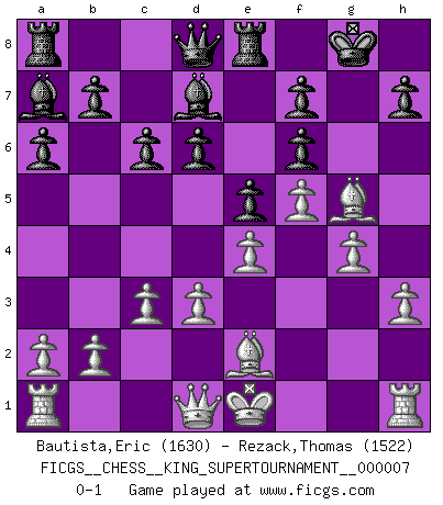 Last move : 0-1 2020 June 2 9:34:10 [Event "FICGS__CHESS__KING_SUPERTOURNAMENT__000007"] [Site "FICGS"] [Date "2020.04.16"] [Round "1"] [White "Bautista,Eric"] [Black "Rezack,Thomas"] [Result "0-1"] [WhiteElo "1630"] [BlackElo "1522"] 1.e4 e5 2.f4 Nf6 3.d3 Bc5 4.Nf3 d6 5.h3 Nc6 6.f5 Bd7 7.Nc3 a6 8.Bg5 O-O 9.Nd5 Re8 10.Be2 Nd4 11.Nxd4 Bxd4 12.c3 Ba7 13.g4 c6 14.Nxf6+ gxf6 0-1 This chess game has been lost on time (started : 2020.04.16 16:9:28) KGD : 2...Nf6 Kingside Castling by player Black (move 8) Player Black won this chess game. Follow this game move after move (download)I still hope to kill Fischer. (Boris Spassky) Im Spitzenschach von heute geht es nur um Vorbereitung, um tiefgründige, sorgfältige Eröffnungsvorbereitung. (Nigel Short) Un buen sacrificio es aquel que aunque no sea necesariamente sólido, deja a tu oponente aturdido y confuso. (Rudolph Spielmann) Un millionnaire : 'Monsieur Steinitz ! Vous ne participez aux tournois que pour l'argent, alors que moi je n'y viens que pour l'honneur.' Steinitz : 'Chacun joue pour ce qu'il n'a pas'... The only sure thing about luck is that it will change. (Wilson Mizner)