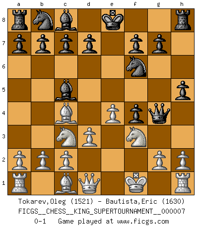 Last move : 0-1 2020 June 14 4:38:56 [Event "FICGS__CHESS__KING_SUPERTOURNAMENT__000007"] [Site "FICGS"] [Date "2020.04.16"] [Round "1"] [White "Tokarev,Oleg"] [Black "Bautista,Eric"] [Result "0-1"] [WhiteElo "1521"] [BlackElo "1630"] 1.e4 e5 2.f4 exf4 3.Bc4 Qh4+ 4.Kf1 Nf6 5.Nf3 Qg4 6.d3 Bc5 7.Nc3 h5 0-1 This chess game has been lost on time (started : 2020.04.16 16:9:28) KGA : Bishop's gambit Player Black won this chess game. Follow this game move after move (download)Chess is in its essence a game, in its form an art, and in its execution a science. (Baron Tassilo) Fallen sollten polizeilich verboten werden. (Savielly Grigorievitsch Tartakower) El Ajedrez es un mar en el cual un mosquito puede beber y un elefante puede bañarse. (Refrán Hindú) Le jeu d'échecs fait naître et fortifie en nous plusieurs qualités précieuses dans le cours de l'existence, telles que la prévoyance, la circonspection, la prudence, et la persévérance. (Benjamin Franklin - 1783, la morale des échecs) Excelling at chess has long been considered a symbol of more general intelligence. That is an incorrect assumption in my view, as pleasant as it might be. But for the purposes of argument and investigation, chess is, in Russkin-Gutman's words, 'an unparalleled laboratory, since both the learning process and the degree of ability obtained can be objectified and quantified, providing an excellent comparative framework on which to use rigorous analytical techniques.' (The Chess Master and the Computer, by Garry Kasparov - 2010)